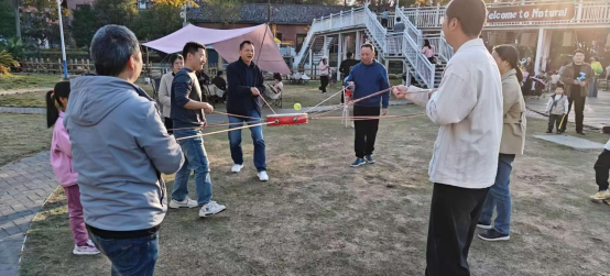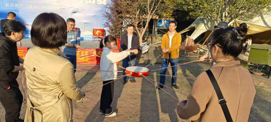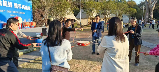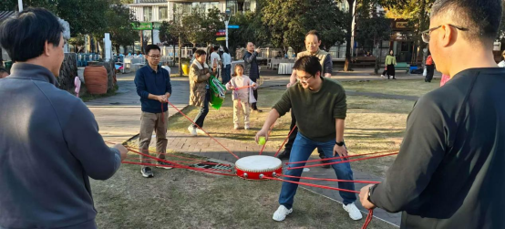 游园完毕,工会还组织大家集中开展了“鼓动人心”团建游戏。秋日暖阳轻抚着草坪,洒下温暖的光斑。大家分组围成一圈,紧握着系在鼓边的彩绳,屏息凝神。“三、二、一!”鼓面轻扬,网球应声跃起,在秋风中划出欢快的弧线。每一次默契的起伏,都伴着兴奋的欢呼与笑语。有人数着颠起的次数,有人调整着绳子的力道,失误时相视一笑,成功时击掌庆贺。在秋日澄澈的蓝天下,那面跃动的鼓与飞舞的球,仿佛将整个团队的节奏与心跳,都融进了这片金色的宁静里。