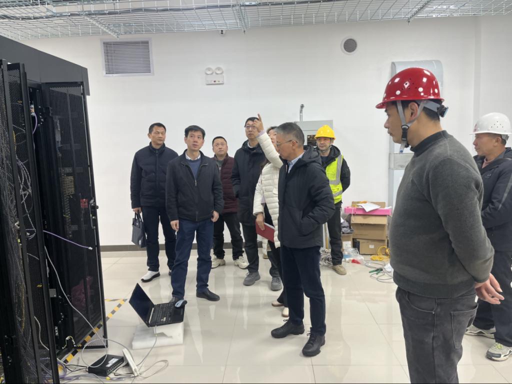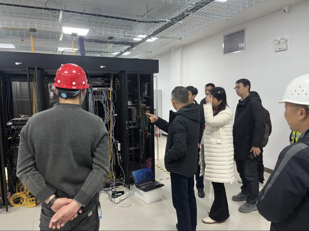 在施工现场,蒋建湘副书记认真听取了项目负责人关于项目规划、施工进度、设备安装及假期运维保障方案的汇报,详细察看了机房环境改造、电力系统升级、消防设施配备及布线工艺等关键环节,并对施工现场的封闭管理、人员值守情况进行了细致检查。