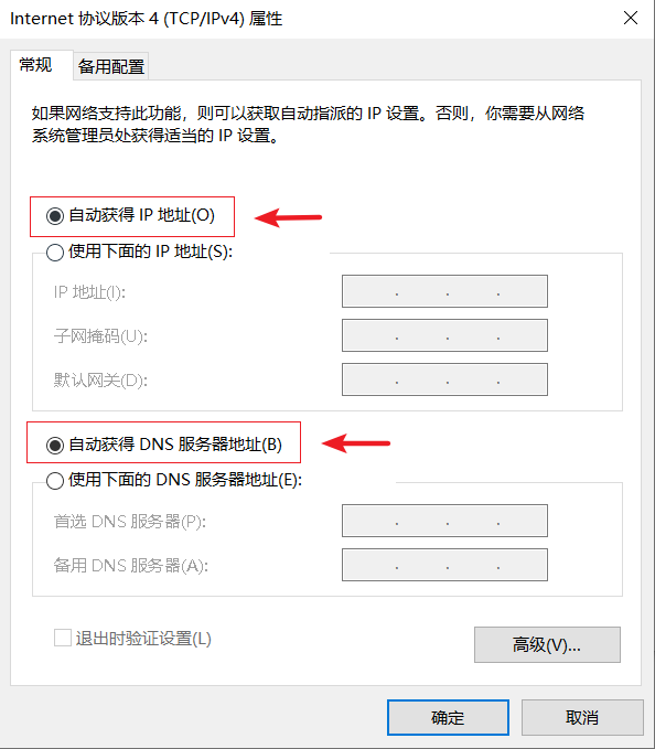 4.点选【自动获得IP地址】和【自动获得DNS服务器地址】。