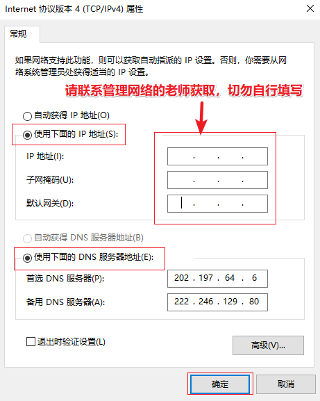 4.点选【使用下面的IP地址】和【使用下面的DNS服务器地址】,填入领取的IP地址参数。