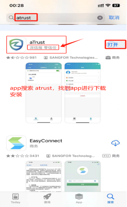 2. 移动端:应用市场搜索“aTrust”并下载,安装完成并打开,在服务器地址一栏输入:https://vpn.csu.edu.cn,点击“连接”。