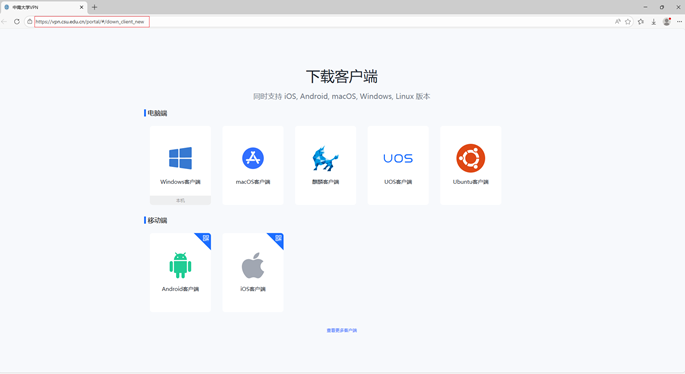 1. PC端:下载地址:https://vpn.csu.edu.cn/portal/#/down_client_new,点击对应安装包进行下载安装。安装完成后,即可打开零信任客户端,在接入设置一栏中输入:https://vpn.csu.edu.cn。